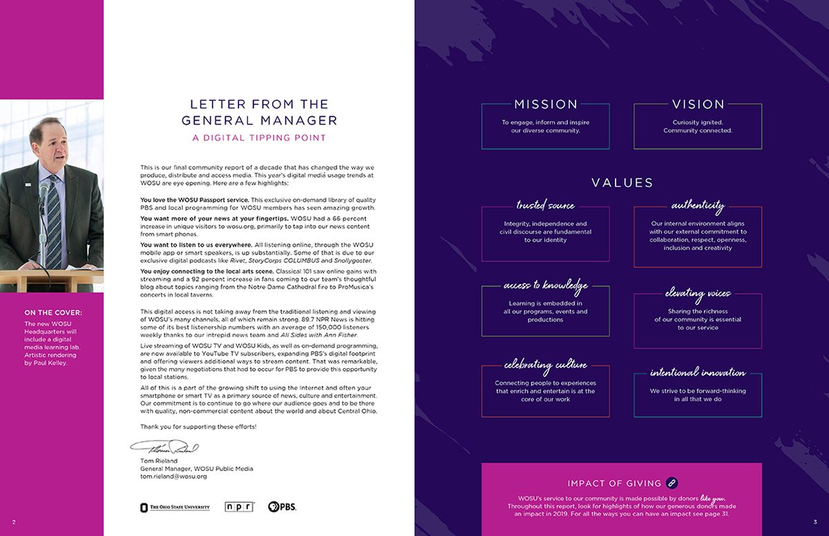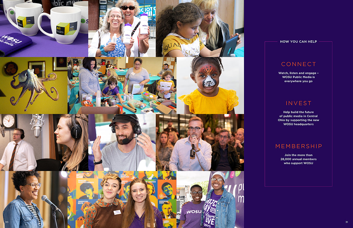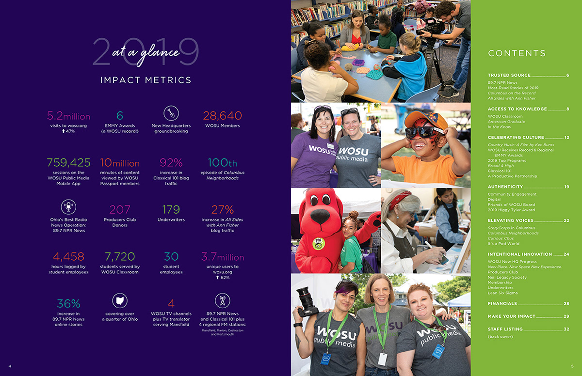 An annual report highlighting a year's worth of accomplishments, community events, and program initiatives at WOSU Public Media - The Ohio State University's public media station.